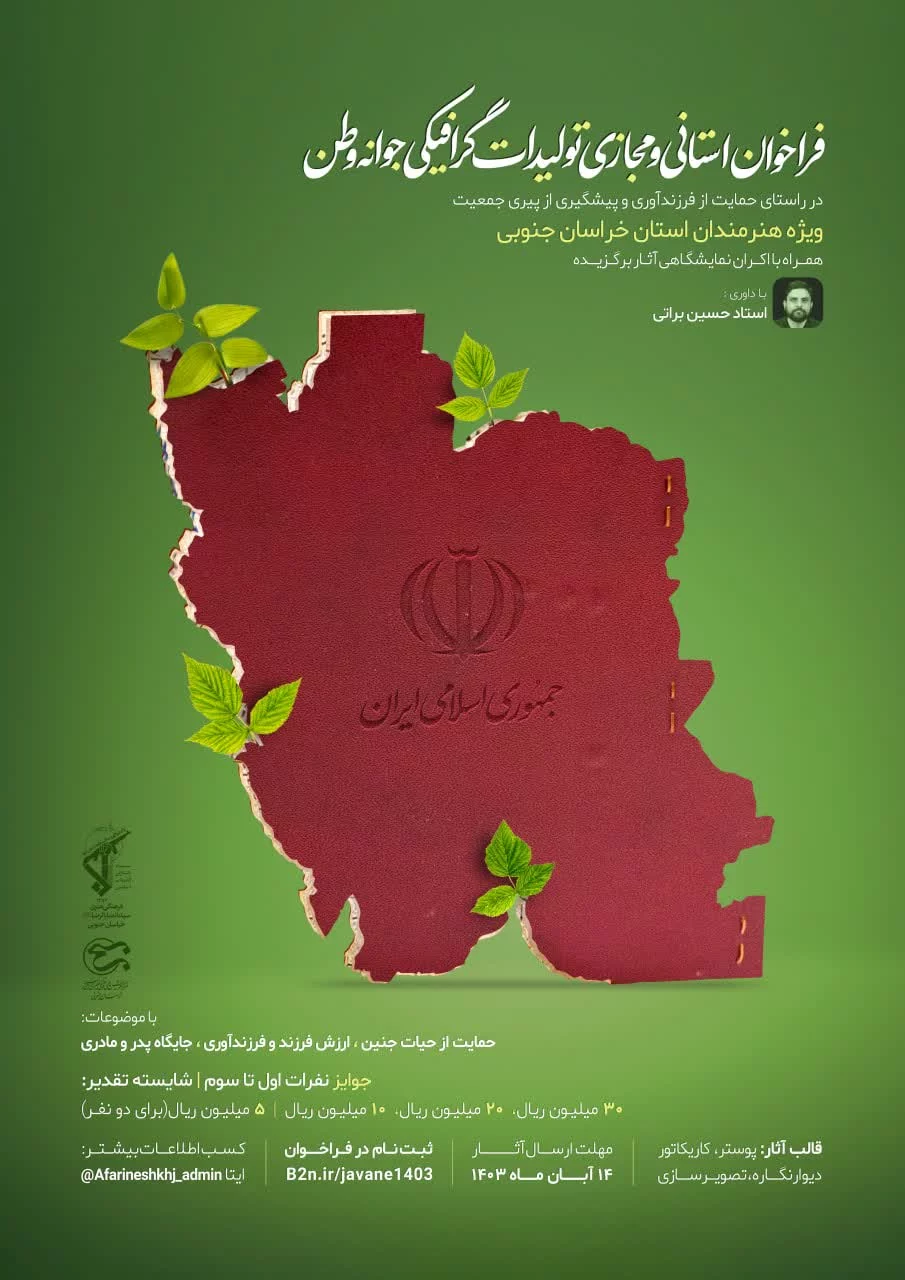 فراخوان استانی و مجازی تولیدات گرافیکی “جوانه وطن”  در راستای حمایت از فرزندآوری و پیشگیری از پیری جمعیت به همراه با اکران نمایشگاهی آثار برگزیده توسط خانه طراحی و تجسمی مرکز آفرینش های فرهنگی هنری بسیج خراسان جنوبی برگزار میکند
