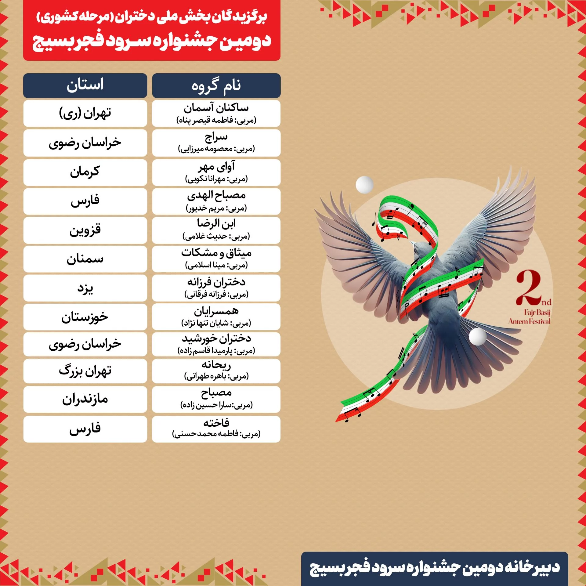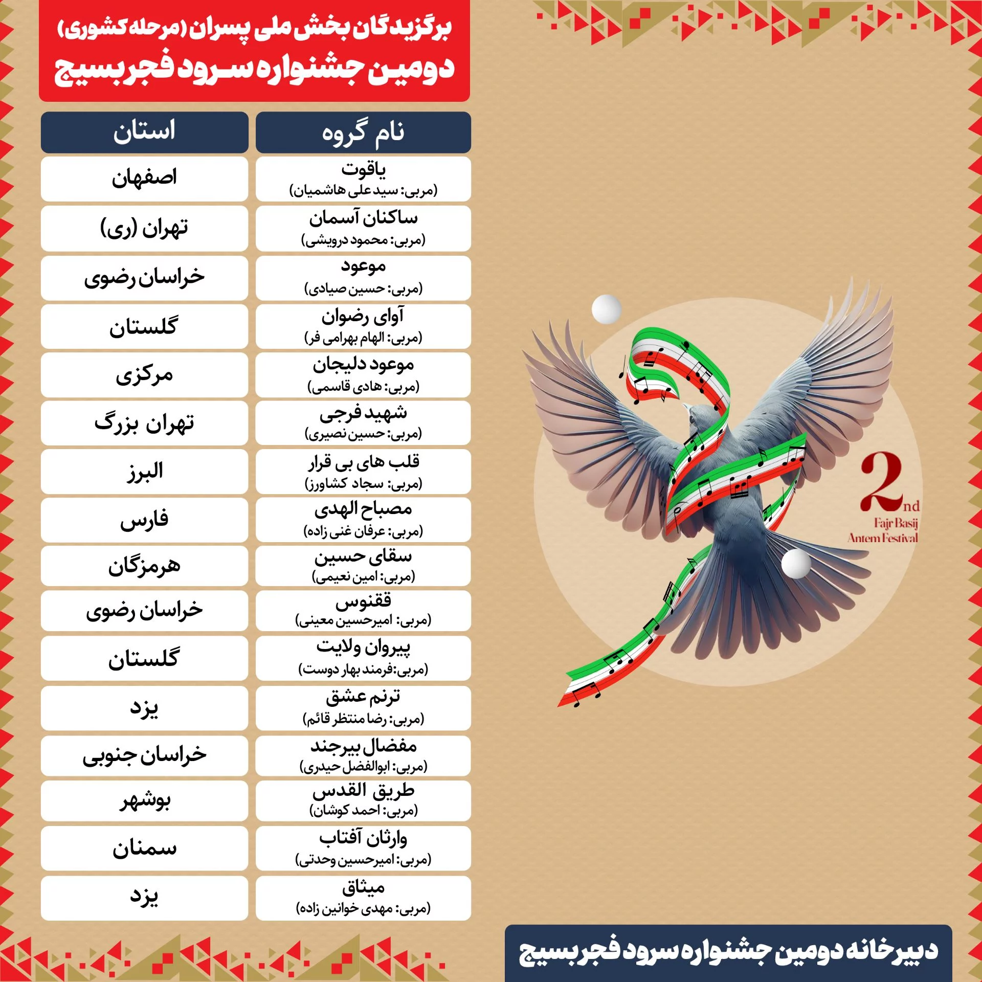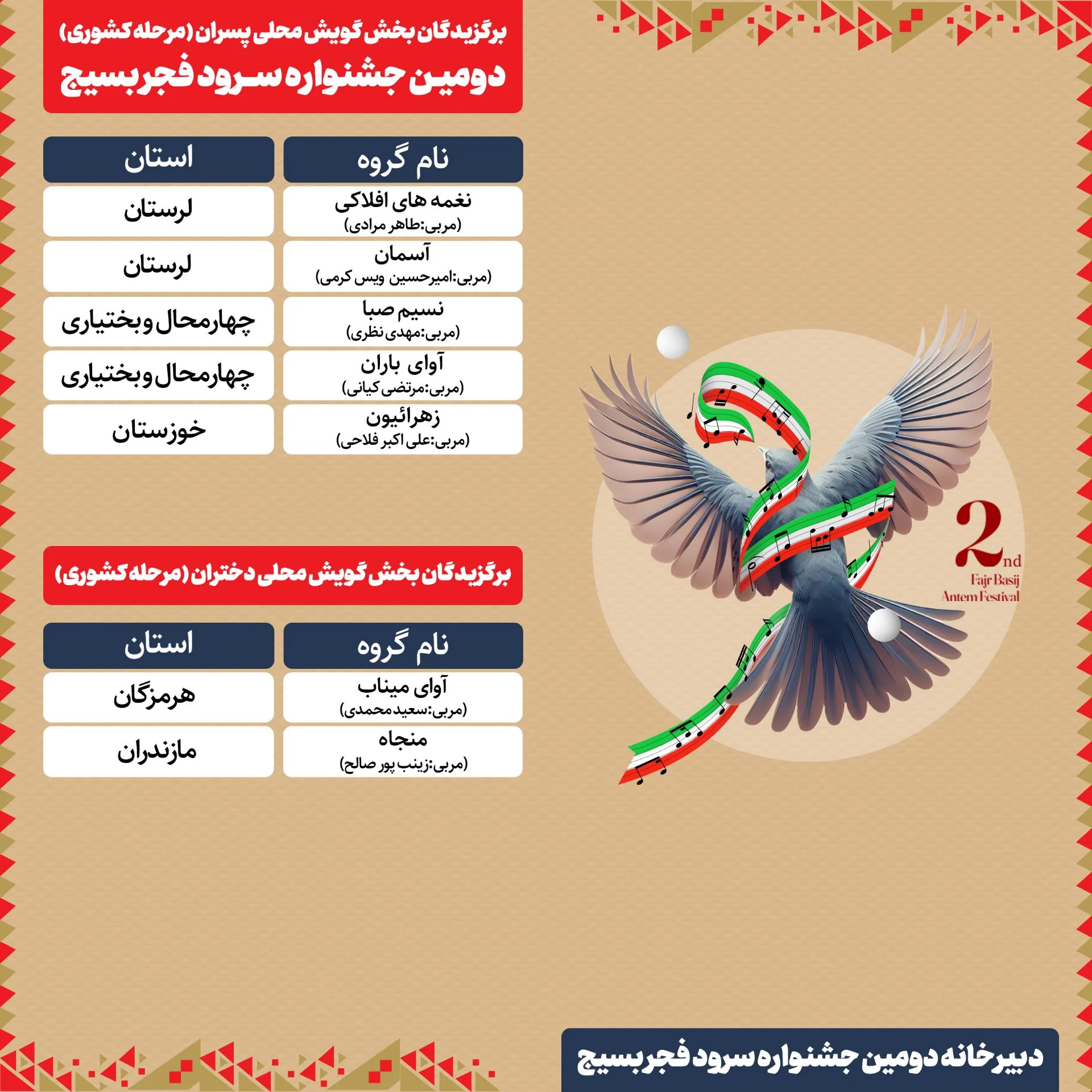 اسامی گروه های برگزیده برای حضور در مرحله کشوری دومین جشنواره ملی سرود فجر به شرح زیر می باشد: