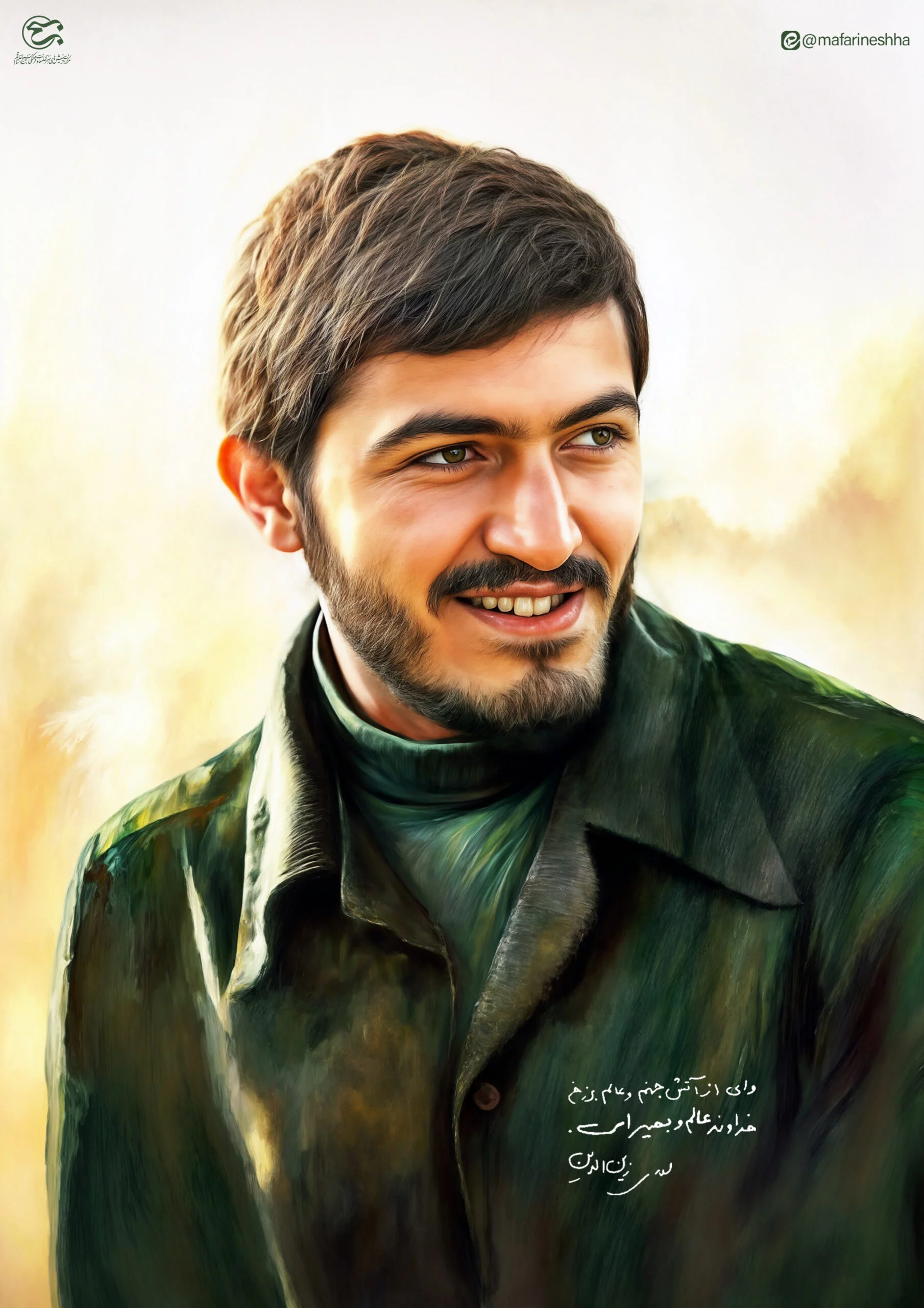 نقاشی سیمای نورانی شهید مهدی زین الدین همراه با دست نوشته ای از شهید.